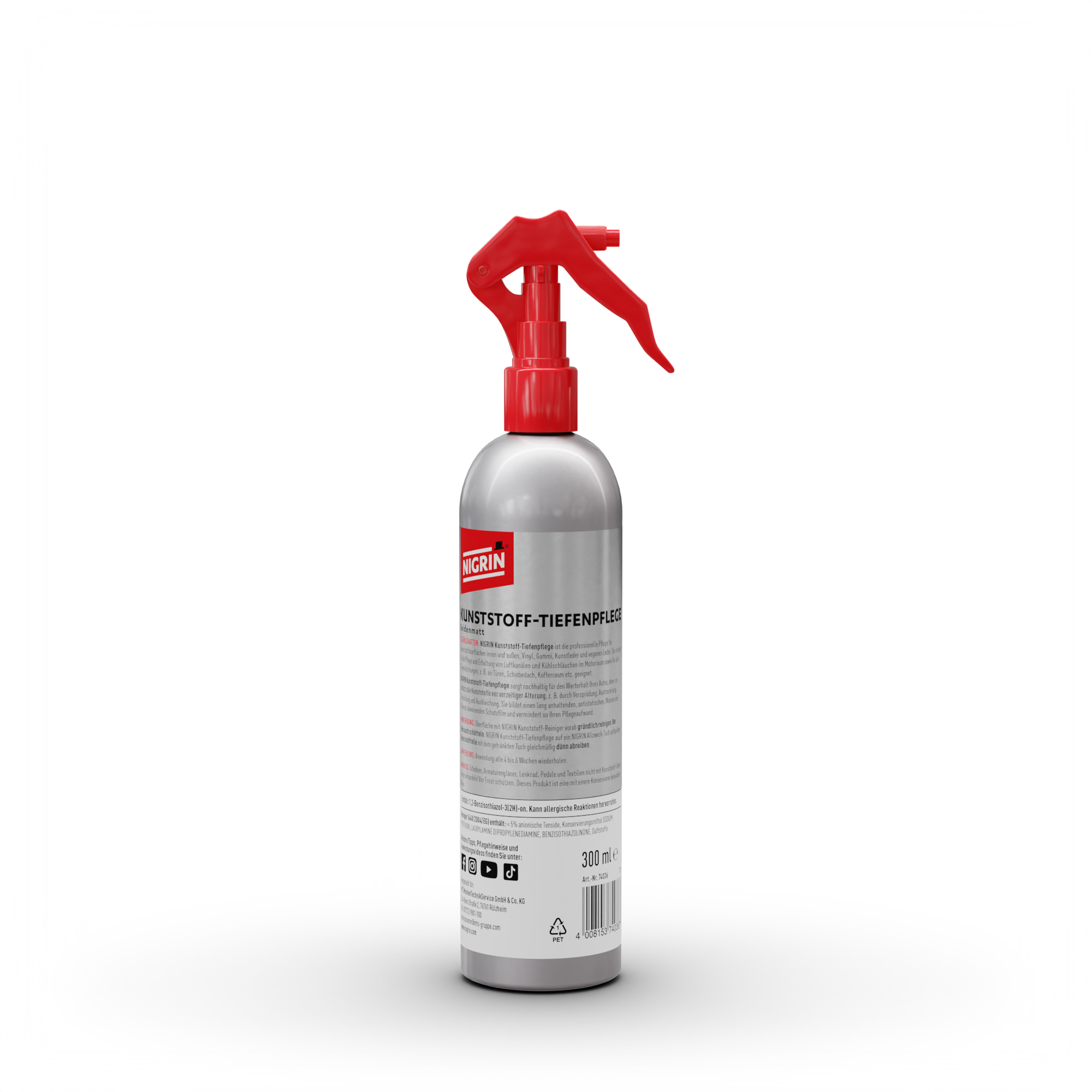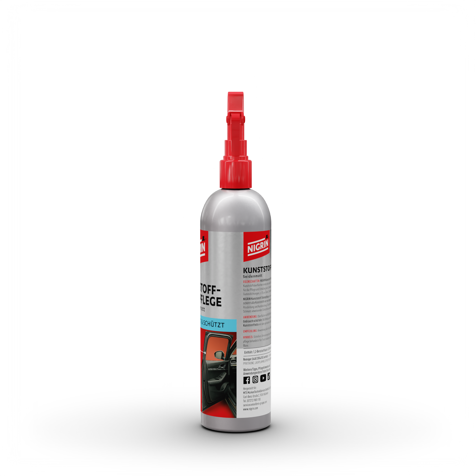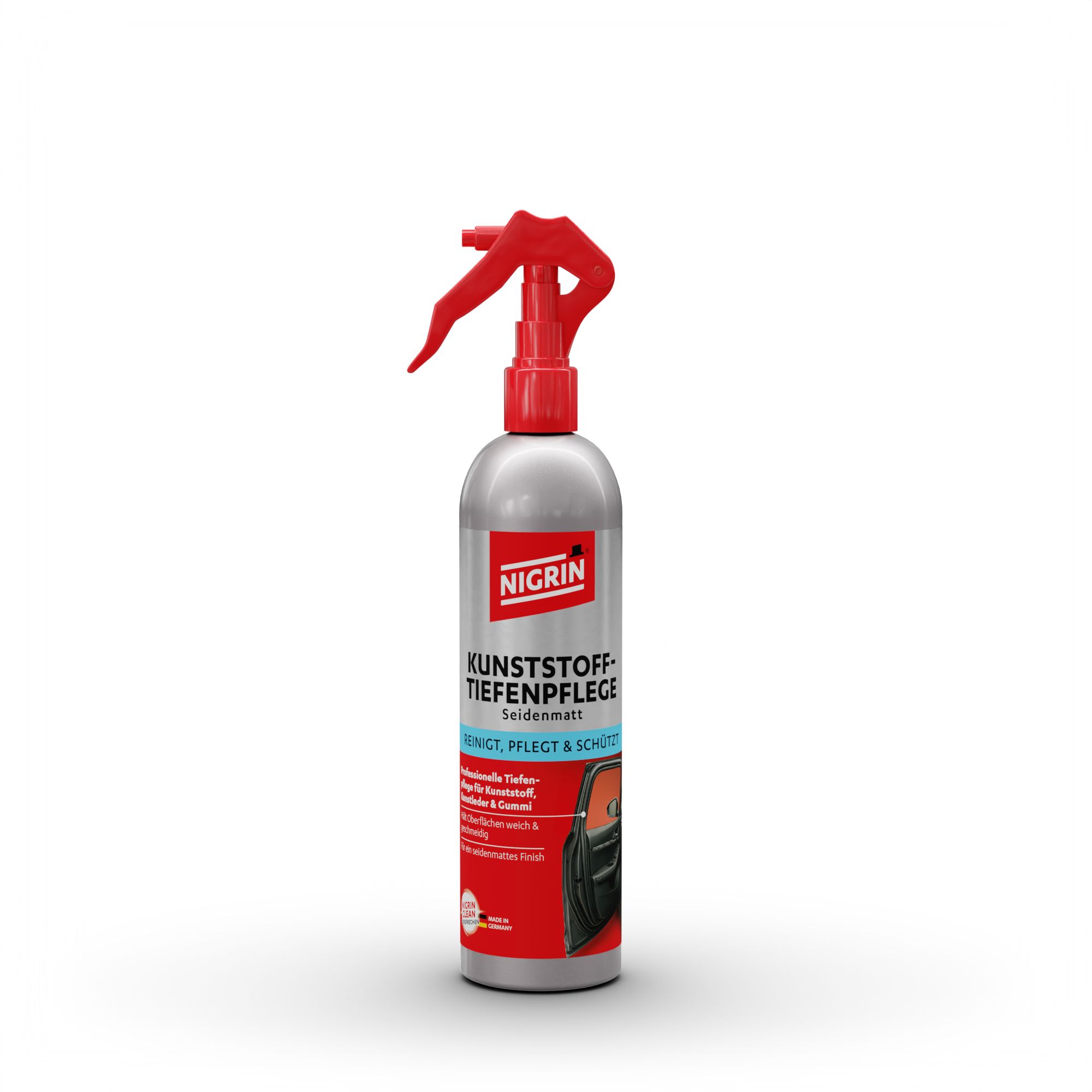 Die NIGRIN Kunststoff-Tiefenpflege Seidenmatt wurde speziell zur Pflege und optischen Auffrischung von Kunststoff- und Gummiteilen im Fahrzeug entwickelt. Sie bringt verwitterte, ausgeblichene Oberflächen zurück in ihren ursprünglichen Zustand – mit einem natürlichen, seidenmatten Finish.