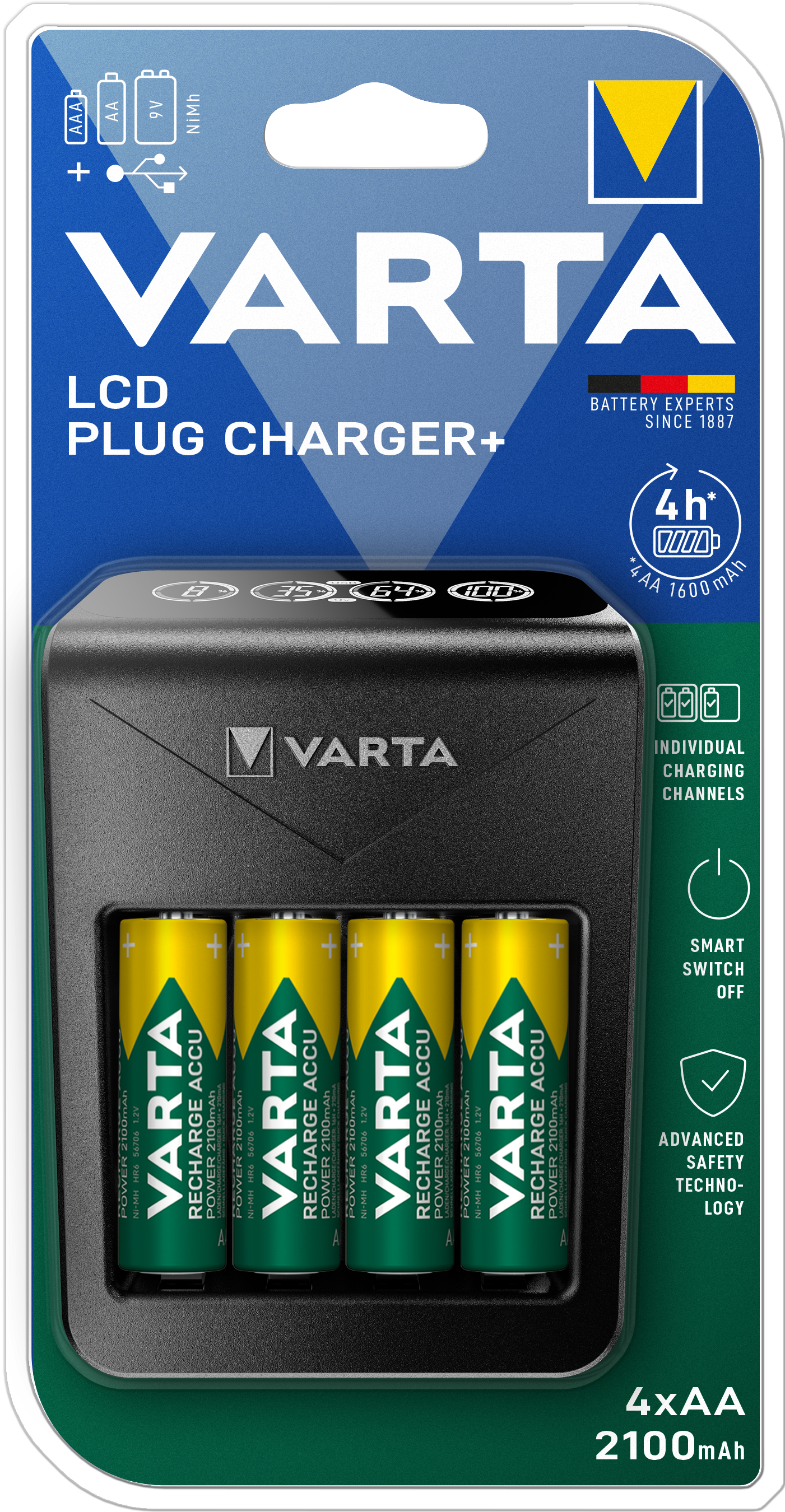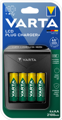 Der VARTA LCD Plug Charger+ ist mit 4x AA 2100 mAh Akkus