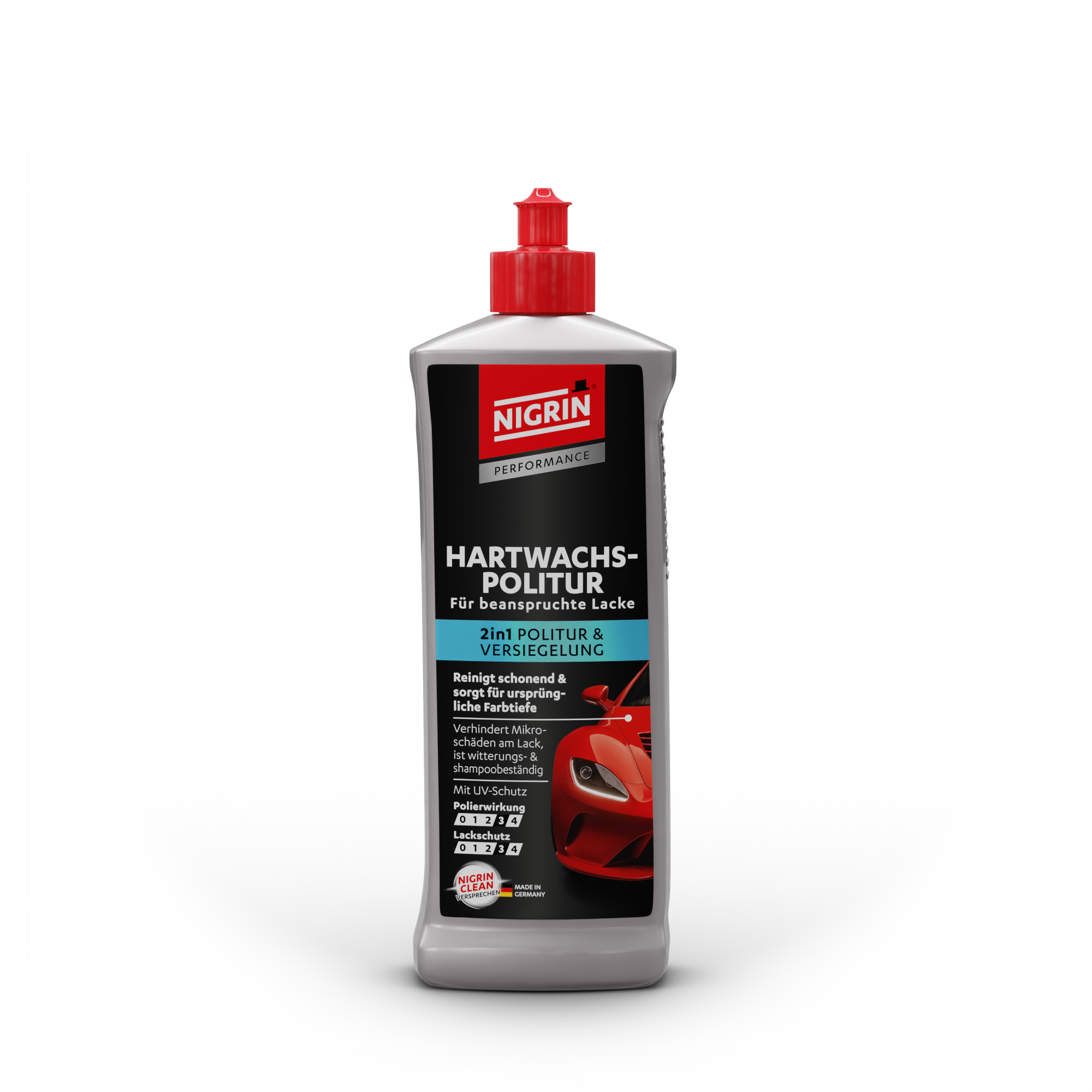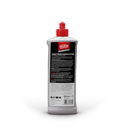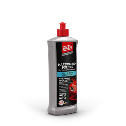 Die NIGRIN Performance Hartwachs-Politur ist ein hochwertiges 2in1-Kombiprodukt zur Reinigung und Versiegelung von leicht beanspruchten Bunt- und Metallic-Lacken. Die verbesserte Rezeptur mit einer sorgfältig abgestimmten Kombination aus hochwertigen Wachsen, Silikonen, UV-Inhibitoren und Antistatika bietet optimalen Schutz und ein strahlendes Glanzergebnis.